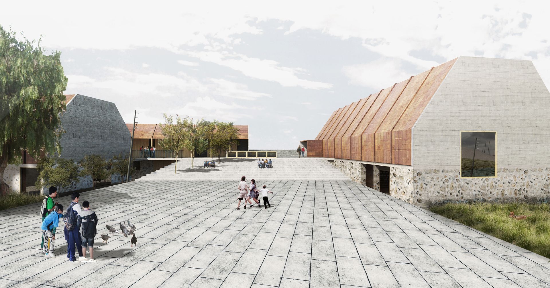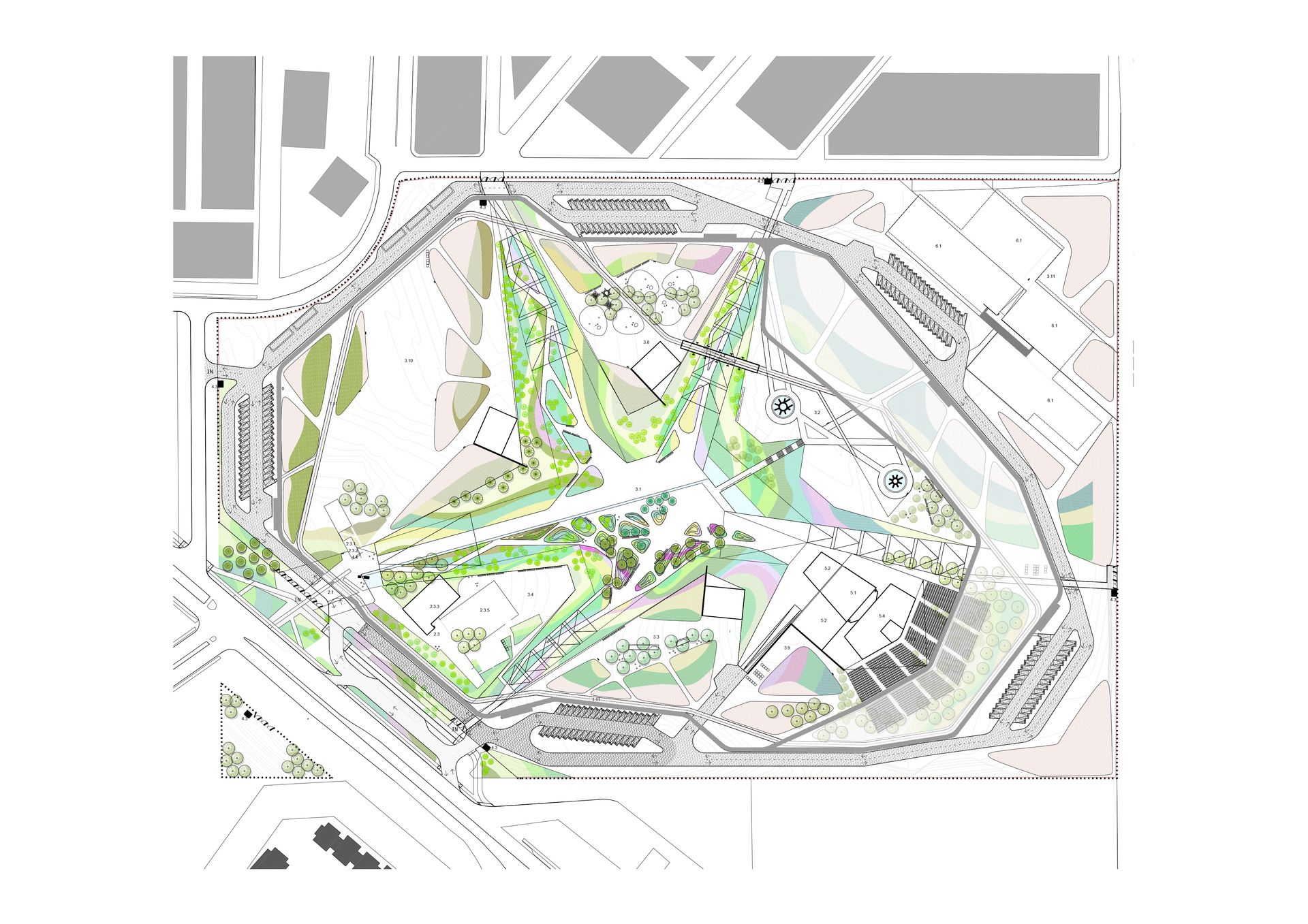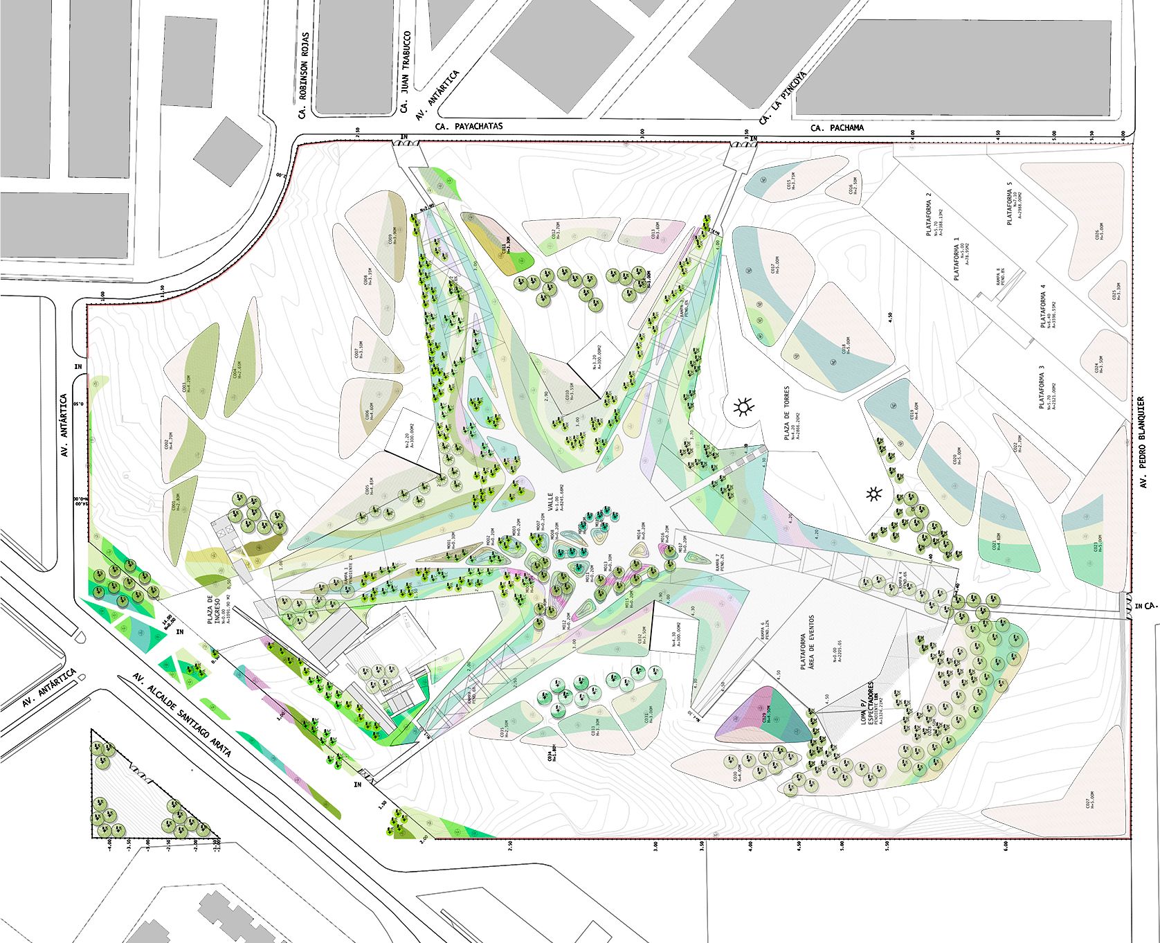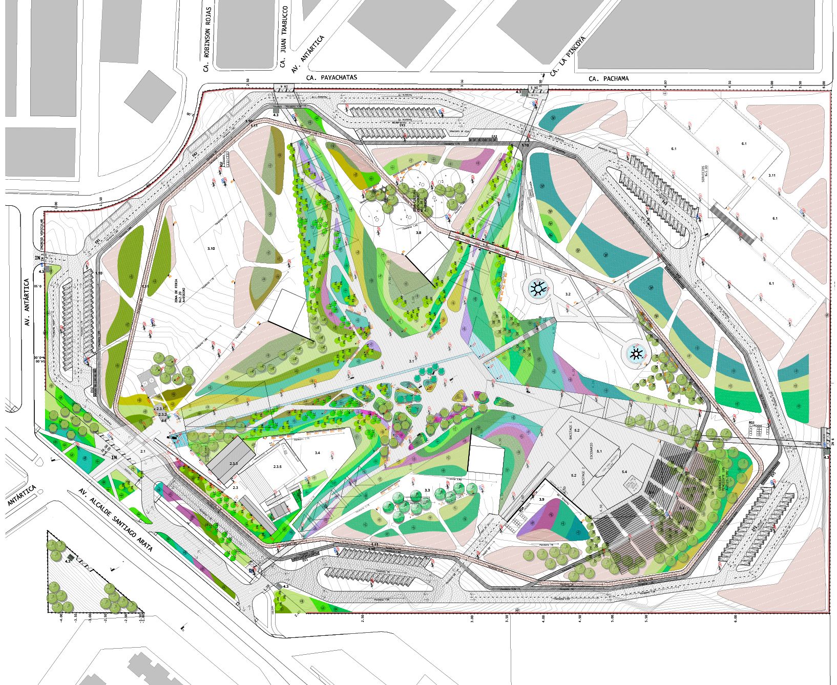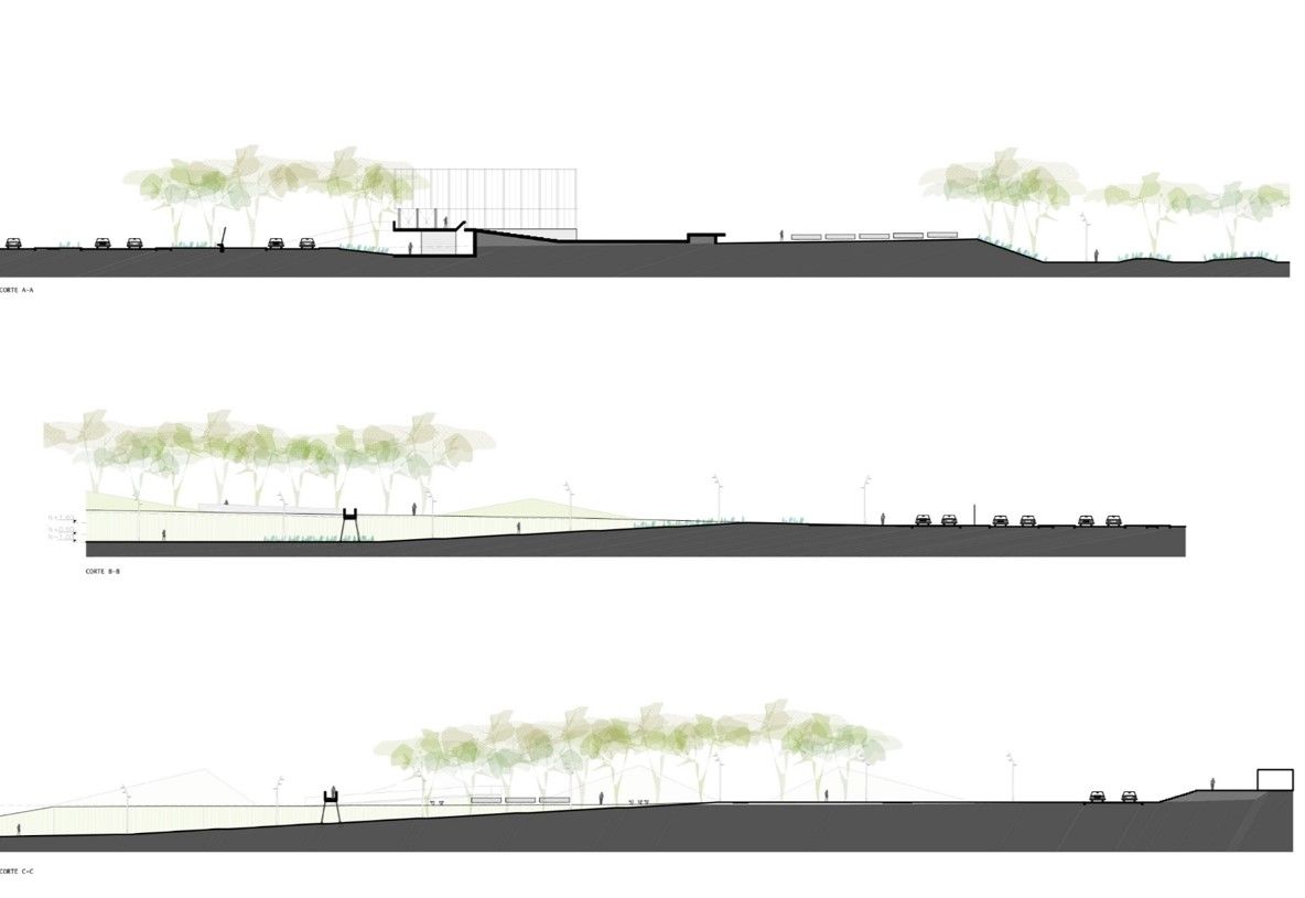 Las edificaciones propuestas, que incluyen el Centro Cultural y servicios, se ubican en el frente principal del terreno, formando una fachada hacia la Carretera Panamericana Norte. Para enfrentar la escala del terreno, se plantea una intervención mediante movimientos de tierra, creando una topografía artificial. Esto implica la excavación para construir un valle y el relleno para crear montículos, generando un paisaje interior con áreas acotadas en las laderas para plantaciones.