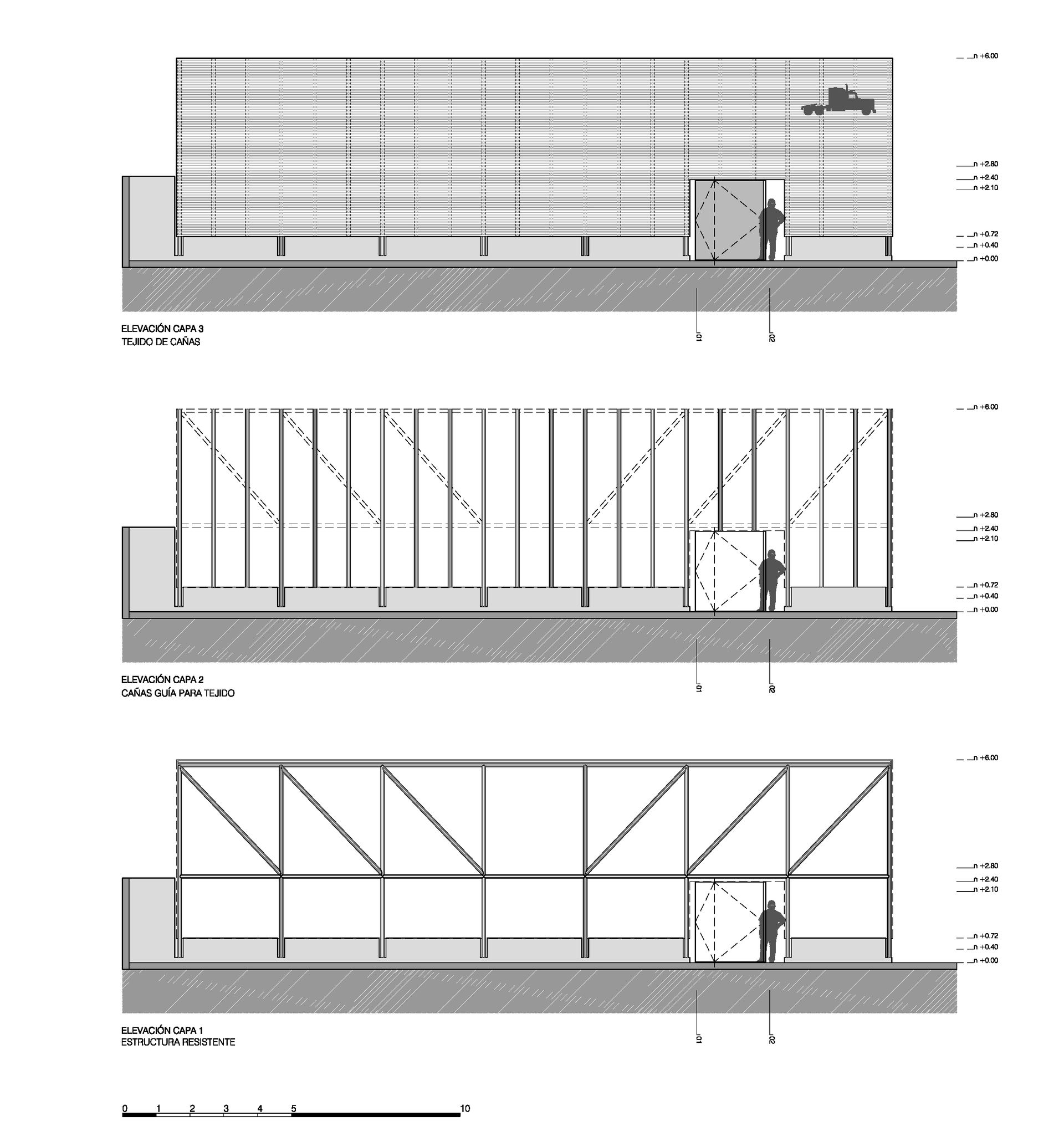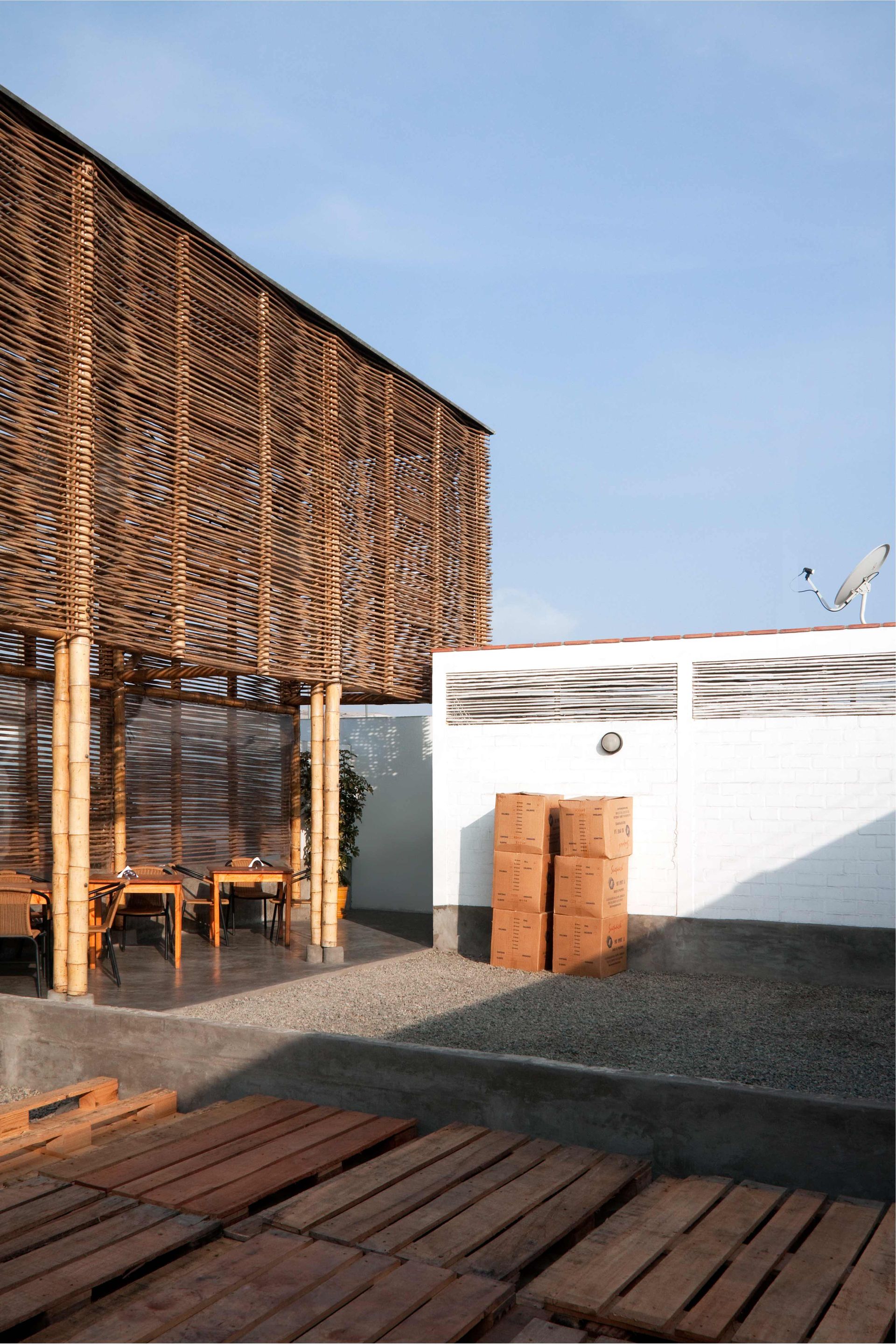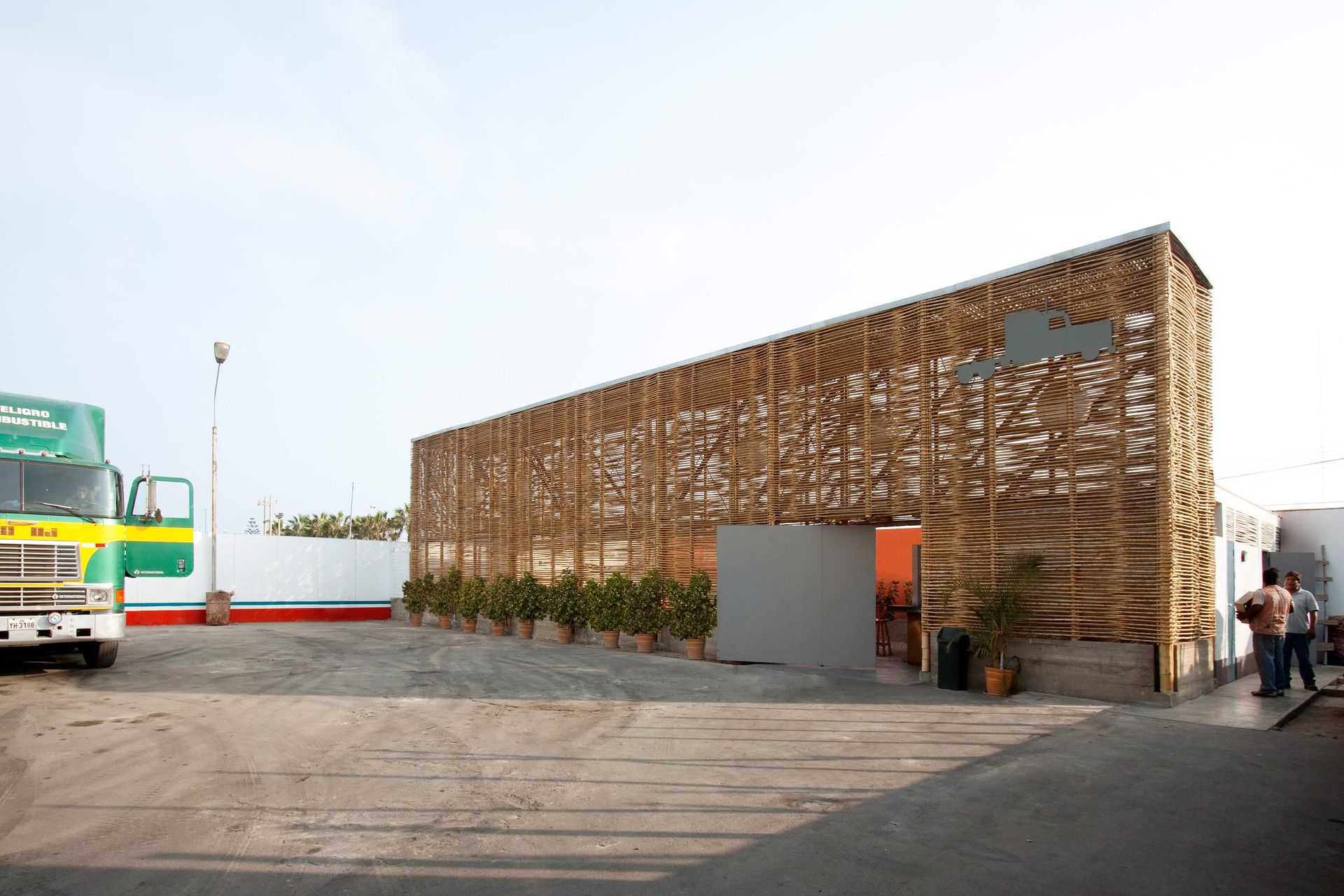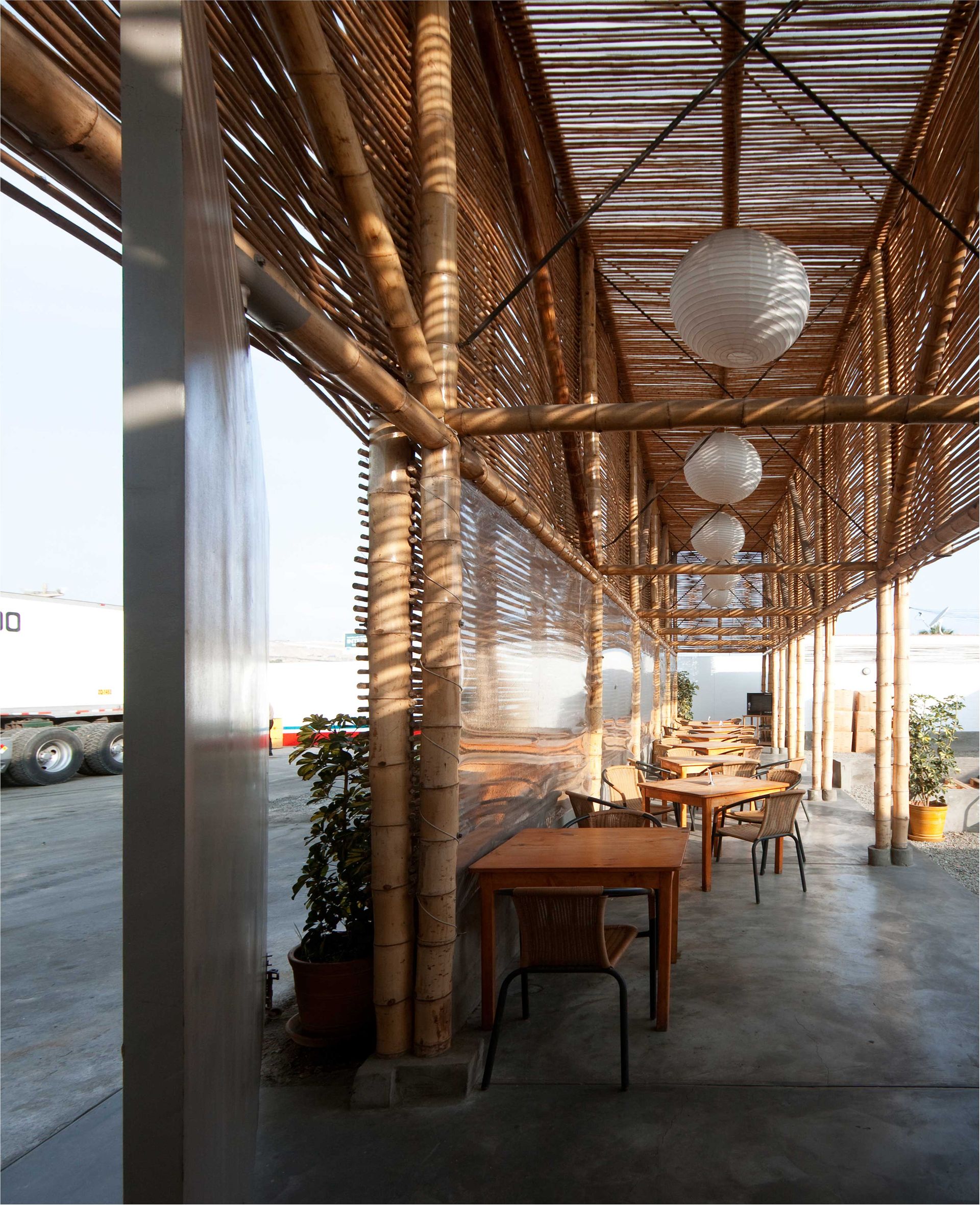 Se construyó el comedor principal como si fuese un camión más del estacionamiento: un volumen de 20 metros de largo, 2.5 metros de ancho y 6 metros de altura, construido a partir de líneas, desde el extremo de las cañas estructurales, como armazón, hasta el tejido fino de la fachada. Un contenedor traslúcido, ventilado y poseedor de una textura y calidez propia que se contrapone al material opaco de los camiones o tráileres estacionados.