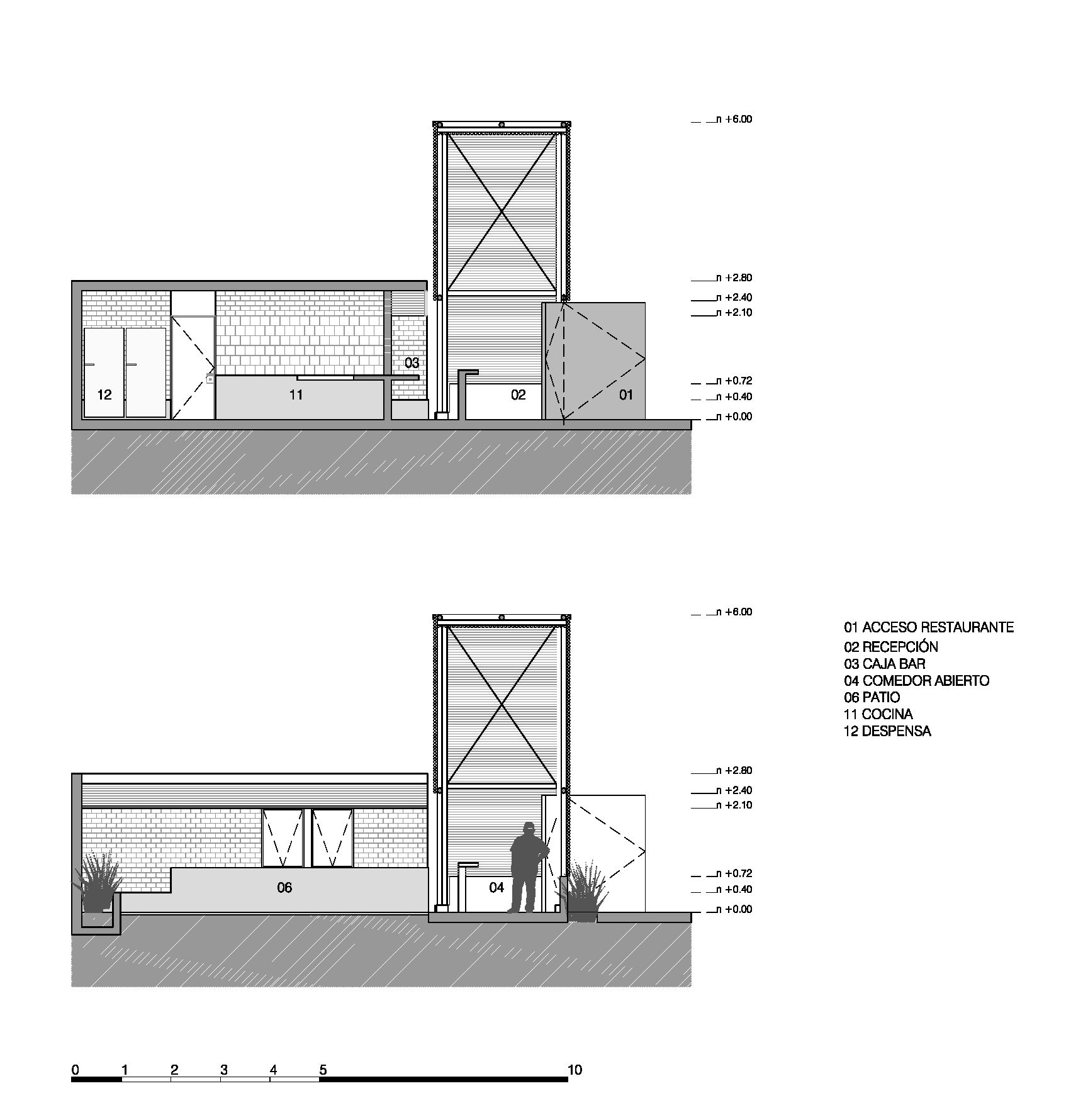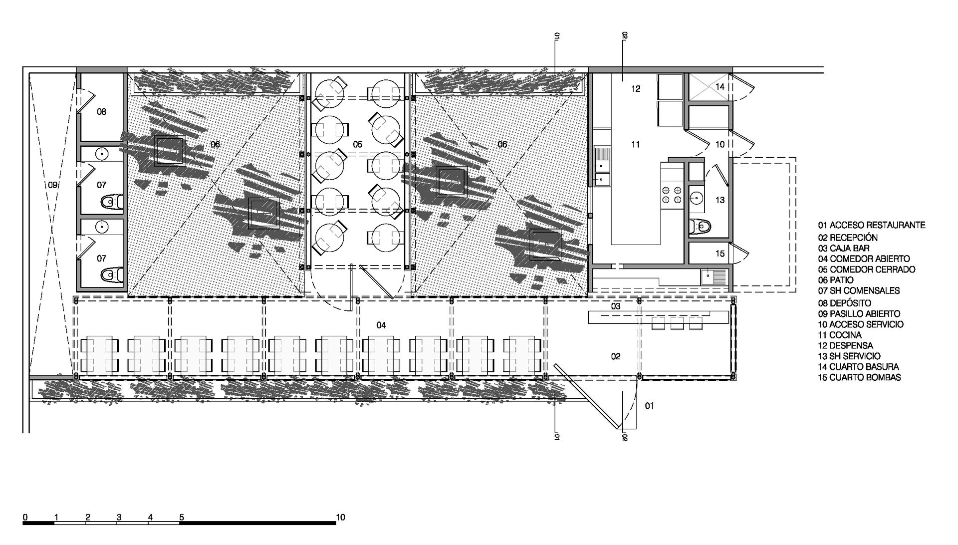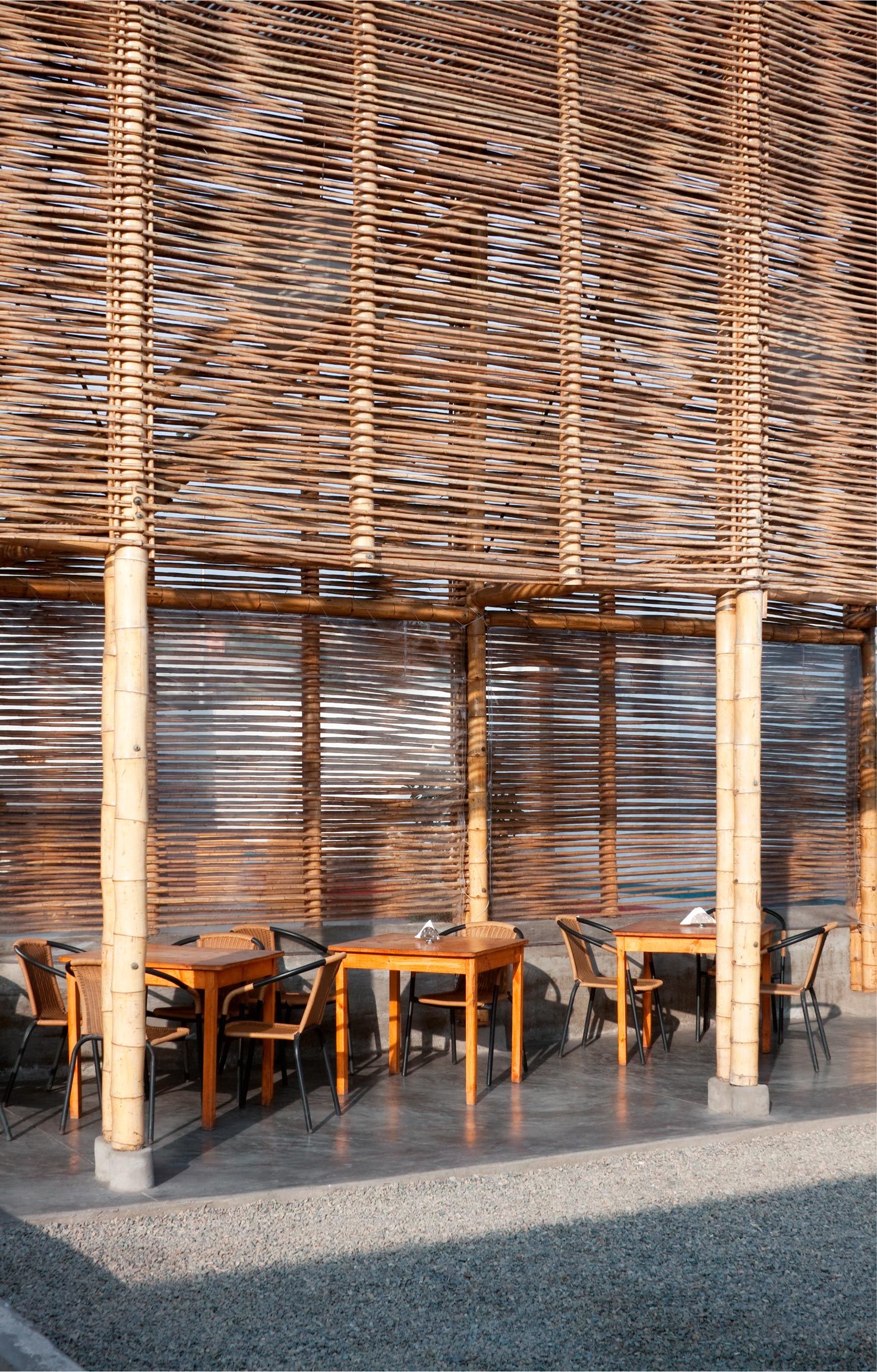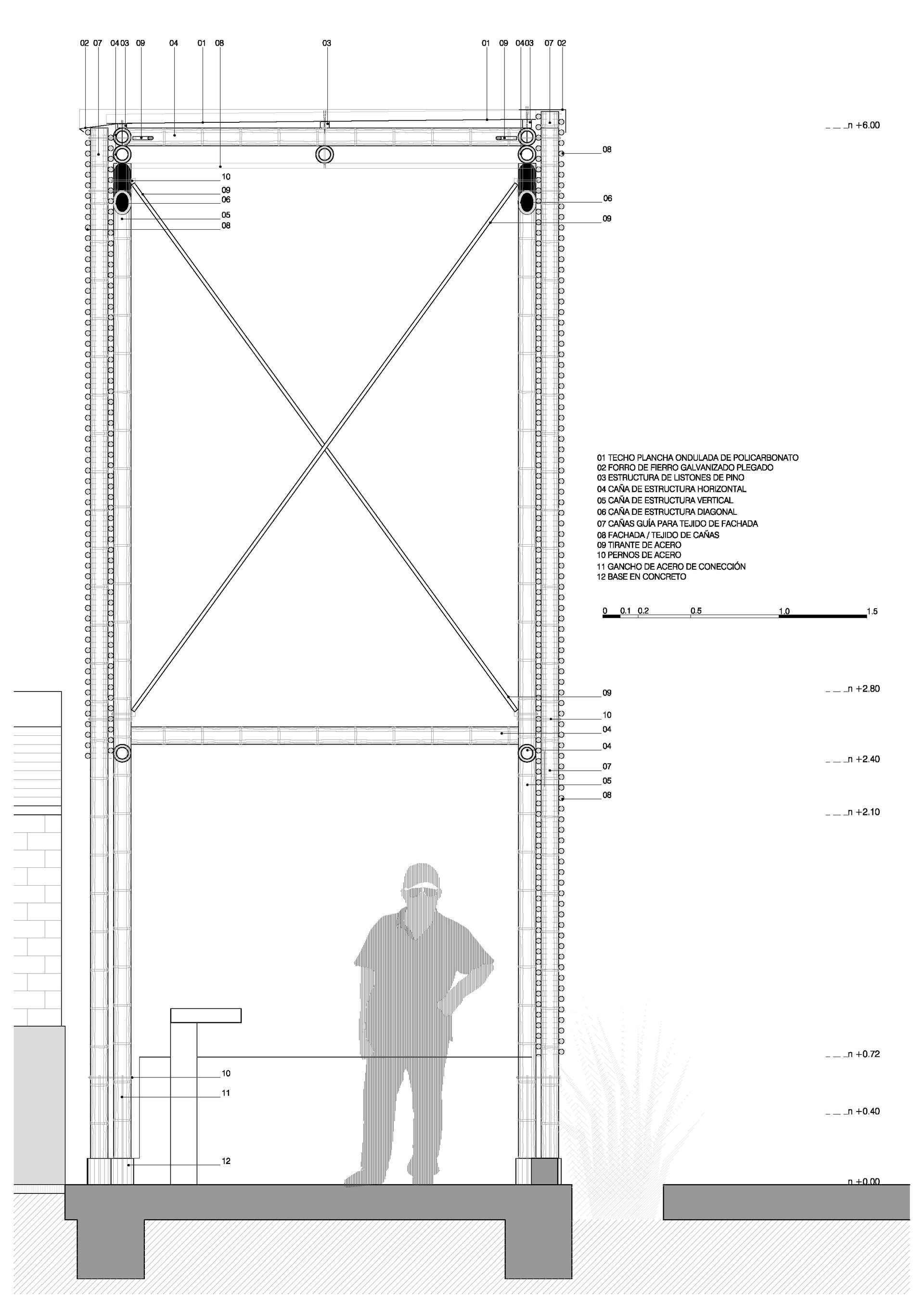 Se construyó el comedor principal como si fuese un camión más del estacionamiento: un volumen de 20 metros de largo, 2.5 metros de ancho y 6 metros de altura, construido a partir de líneas, desde el extremo de las cañas estructurales, como armazón, hasta el tejido fino de la fachada. Un contenedor traslúcido, ventilado y poseedor de una textura y calidez propia que se contrapone al material opaco de los camiones o tráileres estacionados.