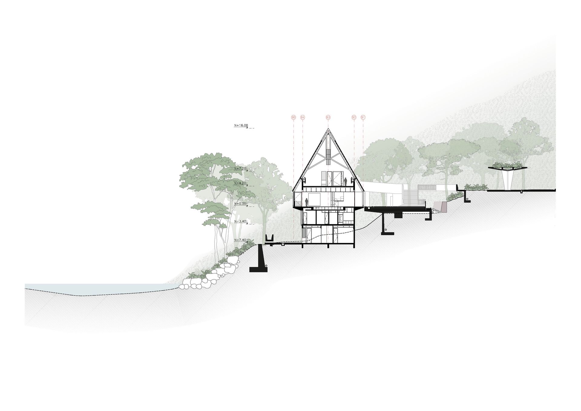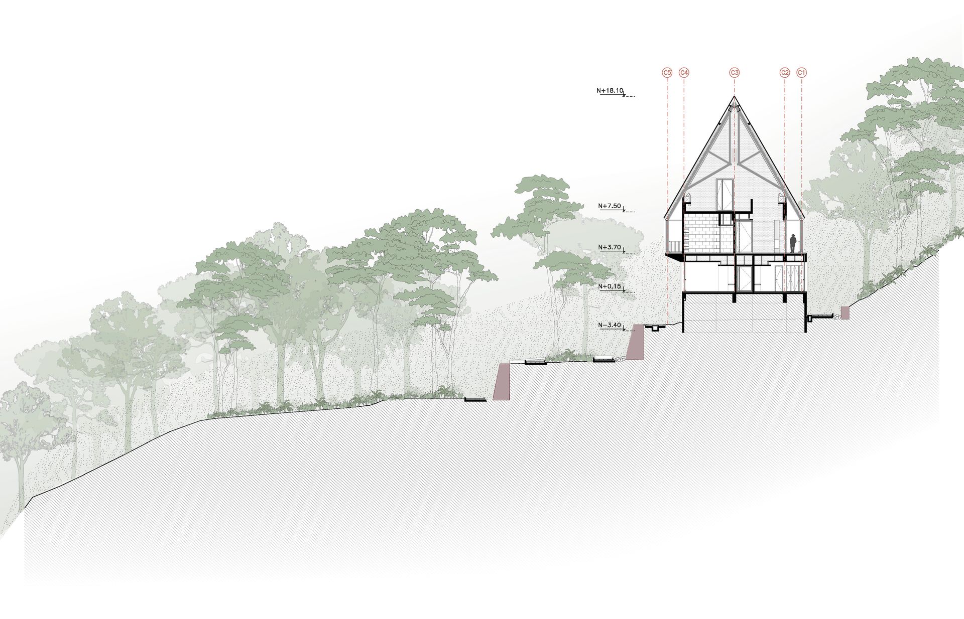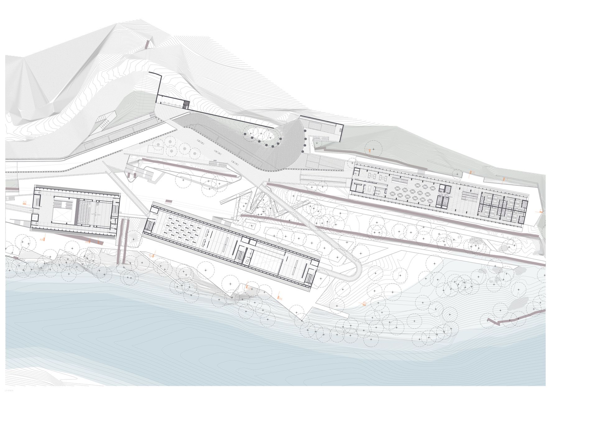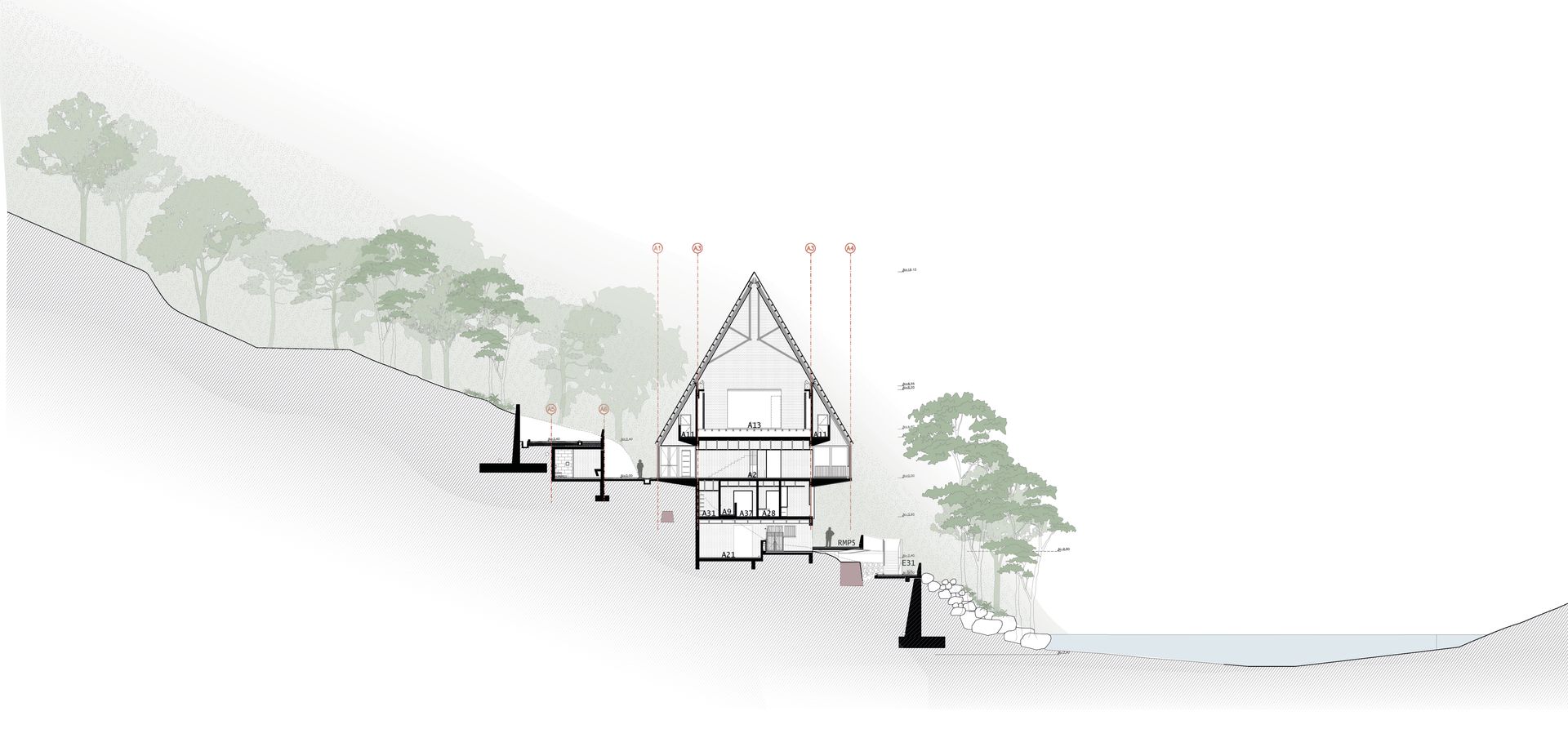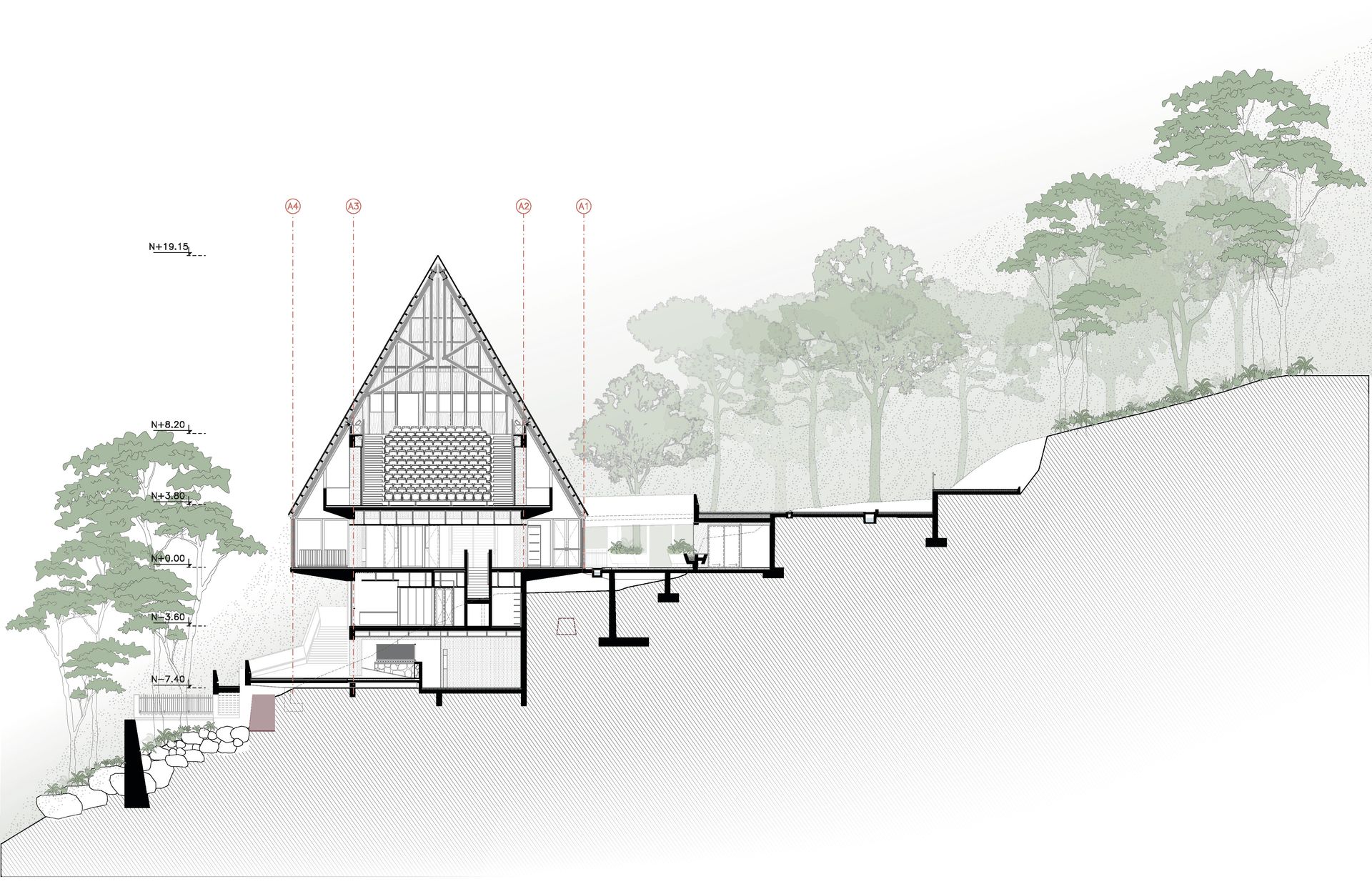 El programa arquitectónico se divide y se organiza en tres edificios principales conectados por diferentes plazas o terrazas. Este conjunto de tres estructuras mantiene la proporción observada en los hastiales inca de la Llaqta, techos que se insertan en el paisaje, abrazados por la geografía y la vegetación.