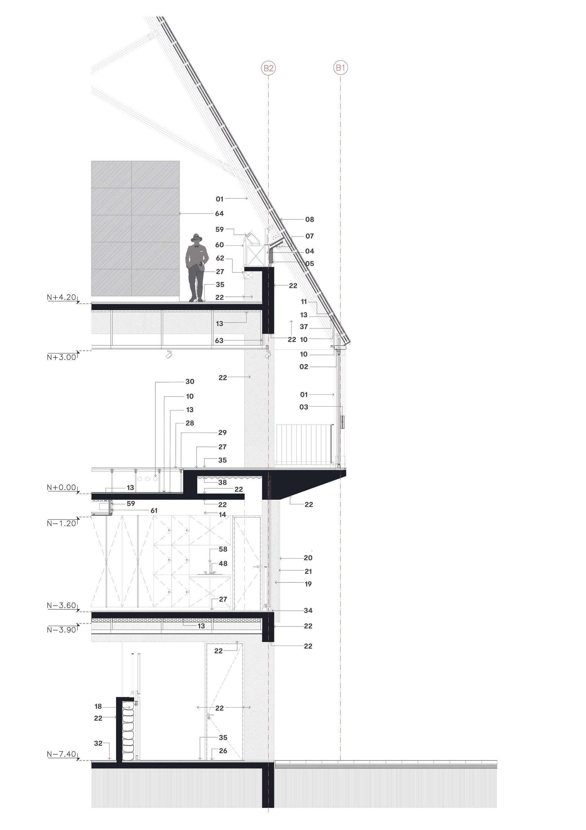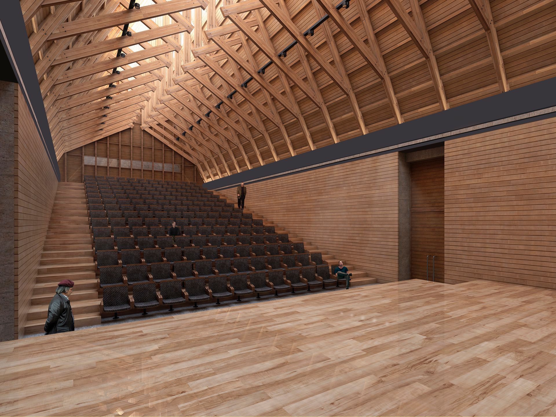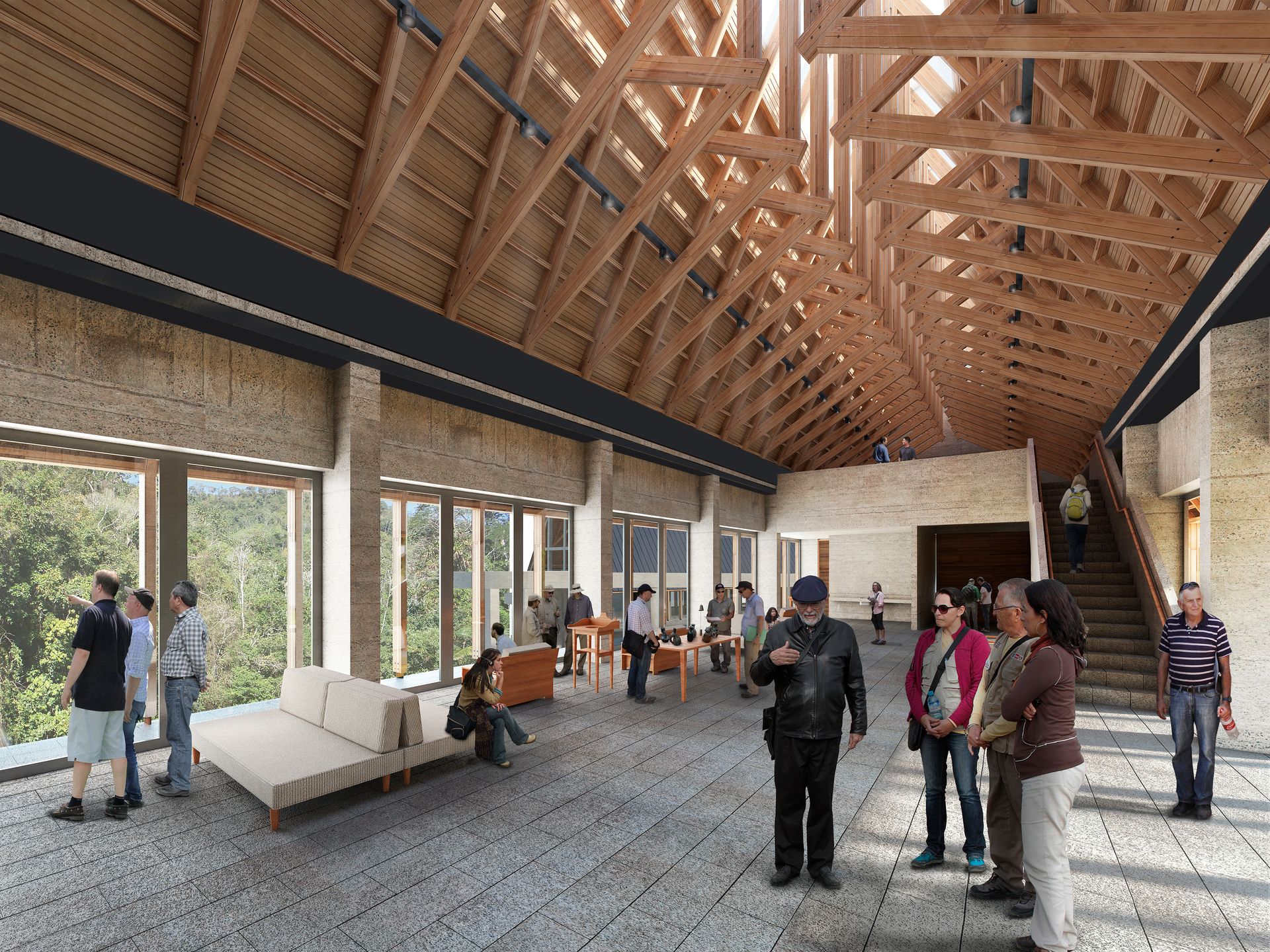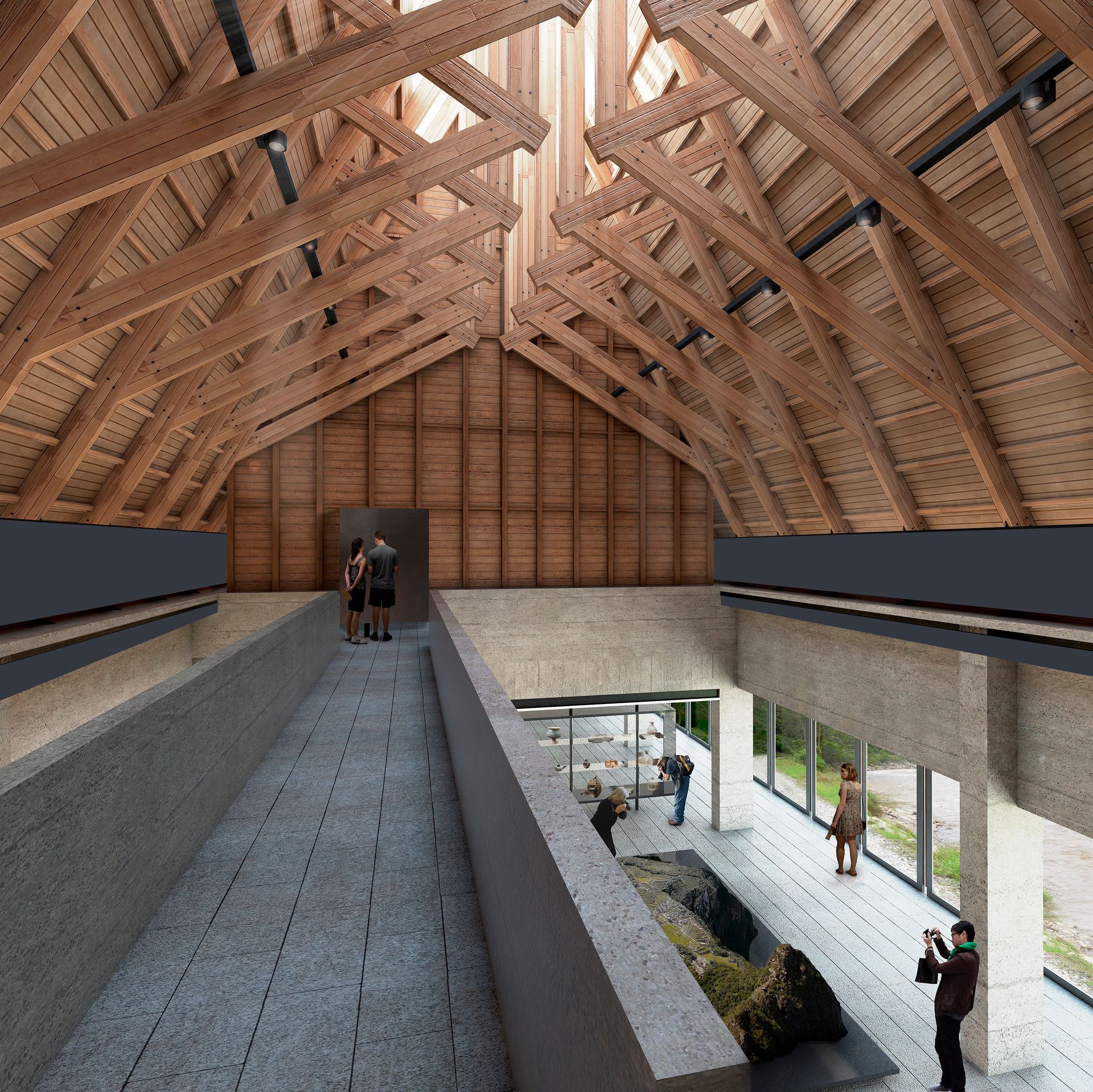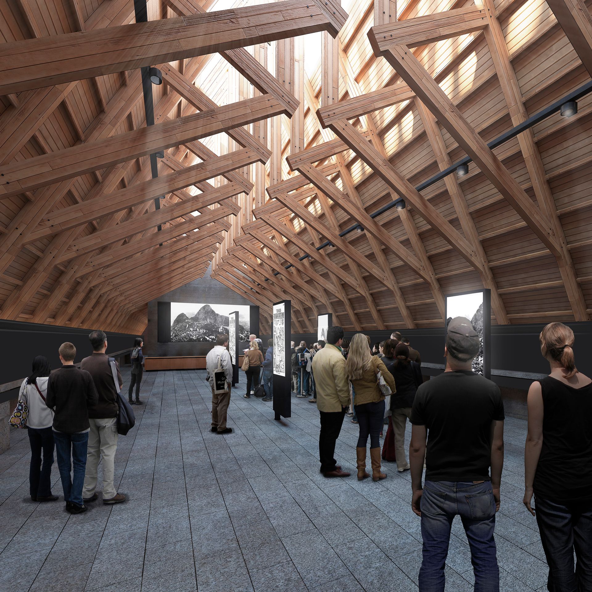Bajo los techos de madera, un gran espacio alberga el programa público del centro de visitantes, reforzando una experiencia de interioridad en oposición a lo grandioso del paisaje exterior, y previo al espectáculo de la cumbre.